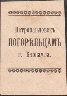 1917 1917 г. Разм. 43 Х 55 мм. Одноцветная печать на толстой белой бумаге. В центре текст в три строки: «Петропавловск Погорельцам г. Барнаула». Сверху и снизу растительный орнамент.