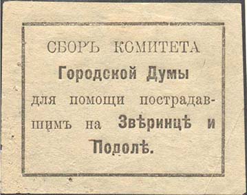 1917 1917(?) г. Разм. рамки 73 х 49 мм. Одноцветная печать на желтой бумаге. В прямоугольной рамке текст в пять строк: «Сбор Комитета Городской Думы для помощи пострадавшим на Зверинце и Подоле».