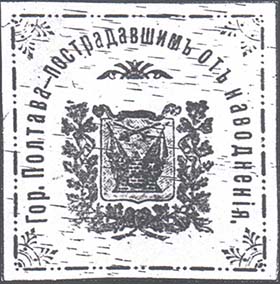 1916 1916(?) г. Одноцветная(?) печать на белой(?) бумаге. В центре в прямоугольной рамке из штрихов и точек разм. 54 х 54 мм. Герб Полтавы. По периметру рамки полукругом текст: «Гор. Полтава – пострадавшим от наводнения».