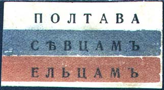 1916 1916(?) г. Разм. 54 х 29 мм. Трехцветная печать на белой бумаге. Виньетка в виде российского флага. Текст в три строки: «Полтава Севцам Ельцам».