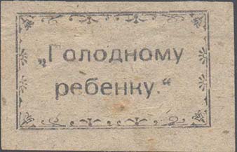 1922 1922 г. Разм. 36 х 56 мм. Одноцветная печать на тонкой серо-зеленой бумаге. В прямоугольной рамке разм. 28 х 46 м с орнаментом с внутренней сто-роны текст в две строки: ««Голодному ребенку»».