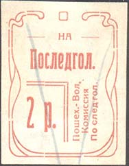 1923 1923 г. Разм. 30 х 40 мм. Одноцветная печать на толстой белой бумаге. В фигурной рамке разм. 26 х 35 мм сверху текст в две строки: «На последгол». Внизу слева номинал. Справа вертикально снизу вверх текст в три строки: «Пошех[онско]. – Вол[одарская]. Камиссия Последгол».