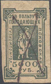 1922 1922 г. Разм. Рамки 23 х 37, 5 мм. Одноцветная печать на тонкой серой бумаге. С клеем. В декоративной рамке фигуры двух детей. По периметру текст: «В пользу голодающих Псковская Губкомпомгол». Внизу и по углам рамки номинал.