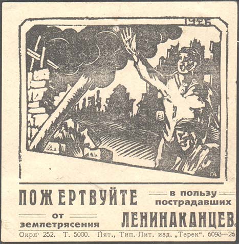 1926 1926 г. Разм. 78 х 80 мм. В центре в прямоугольной рамке с усеченными верхними углами разм. 69 х 55 мм мужчина с поднятой вверх правой рукой и женщина на фоне разрушенного города. Внизу под рамкой текст в три строки в две колонки текст: «Жертвуйте в пользу пострадавших от землетрясения Ленинаканцев». Внизу под чертой мелким шрифтом выходные данные: «Окрл 252. Т. 5000. Пят., Тип.-Лит. Изд. «Терек» 6093-26».