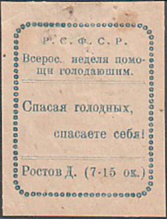 1921 1921 г. 07.-15.10.1921 г. Разм. 42 х 55 мм. Одноцветная печать на плотной белой бумаге. В рамке из кружков с закругленными краями текст в две строки: «Спасая голодных, спасаете себя». Сверху текст в три строки: «Р.С.Ф.С.Р. Всерос[сийская]. Неделя помощи голодающим». Внизу текст: «Ростов Д. (7-15 ок[тября].)».
