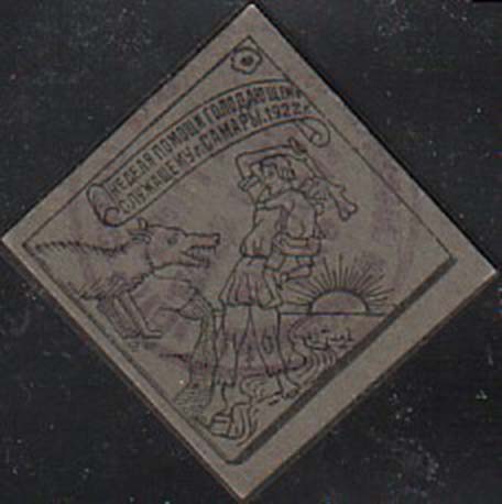 1922 1922 г. Ромб разм. 54 х 54 мм. Одноцветная печать на толстом картоне различных цветов. В рамке в форме ромба разм. 50 х 50 мм аллегорический рисунок, символизирующий победу над голодом: человек замахивается дубиной на волка на фоне восходящего солнца. Сверху на ленте текст в две строки: «Неделя помощи голодающему служащему г. Самары 1922 г.».