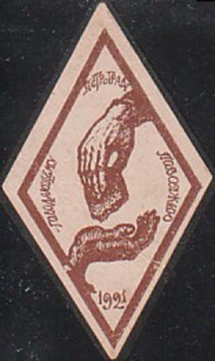 1921 1921 г. Ромб разм. 40 х 66 мм. Одноцветная печать на толстой бумаге с мелованным верхним слоем. В ромбовидной рамке разм. 34 х 58 мм две руки, одна из которых опускает кусок хлеба в другую. По периметру рамки текст: «Петроград голодающему Поволжью 1921 г.».