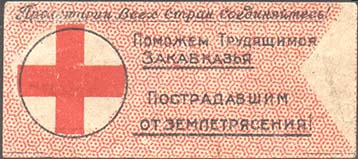 1931 1931 г. Разм. 60 х 27 мм. Двухцветная печать на белой бумаге. На фоне из геометрического орнамента слева в круглой рамке диаметром 18 мм красный крест. Сверху текст: «Пролетарии Всех Стран Соединяйтесь». Справа текст в четыре строки: «Поможет Трудящимся Закавказья Пострадавшим от землетрясения!».