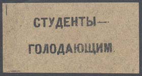 1922 1922 г. Апрель. Разм. 45 х 24 мм. Одноцветная печать на бумаге различных цветов. В центре текст в две строки: «Студенты - голодающим».