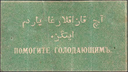 1915 1915(?) г. Разм. 58 х 32 мм. Двухцветная печать на сероватой бумаге. На сплошном фоне в центре текст в две строки на местном языке арабским шрифтом. Внизу текст: «Помогите голодающим».