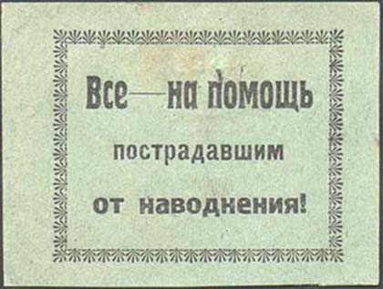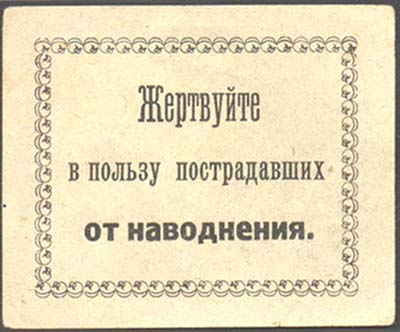 1918 1918 г. Разм. 55 х 45 мм. Одноцветная печать на бумаге различных цветов. В центре в прямоугольной декоративной рамке разм. 45 х 36 мм. из растительного орнамента текст в три строки: «Жертвуйте в пользу пострадавших от наводнения».