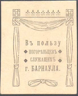 1917 1917 г. Разм. 45 х 55 мм. Одноцветная печать на толстой кремовой бумаге. В центре в орнаментальной рамке сложной формы текст в четыре строки: «В пользу погорельцев служащих г. Барнаула».