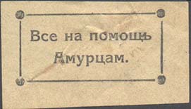 1918 1918(?) г. Разм. 47 х 27 мм. Одноцветная печать на кремовой бумаге. В центре в прямоугольной рамке разм. 34 х 16 мм с кружками по углам текст в две строки: «Все на помощь Амурцам».