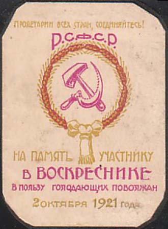 1921 1921 г. 02.09.1921 г. Разм. 53 х 75 мм. Двухцветная печать на толстой белой глянцевой бумаге. В центре серп и молот в обрамлении венка из колосьев. Сверху текст в две строки: «Пролетарии всех стран соединяйтесь! Р.С.Ф.С.Р.». Внизу текст в че-тыре строки: «На память участнику в воскреснике в пользу голодающих Поволжья. 2 октября 1921 г.».