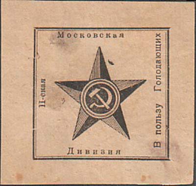 1921 1921(?) г. Разм. 66 х 62 мм. Одноцветная печать на плотной желтоватой бумаге. В двойной прямоугольной рамке разм. 44 х 46 мм в центре эмблема Красной Армии (пятиконечная звезда с серпом и молотом в центре). По периметру рамки с внутренней стороны текст: «Н-ская Московская Дивизия в пользу Голодающих».