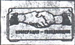 1922 1922(?) г. Разм. 42 х 26 мм. Одноцветная печать на плотной кремовой бумаге. В прямоугольной фигурной рамке две руки в рукопожатии. Внизу текст: «Кооперация-голодающим».