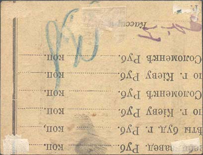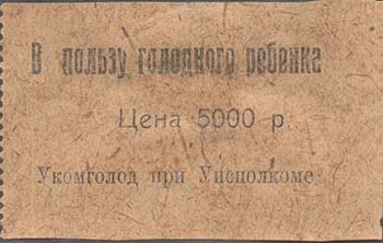1922 1922 г. Разм. 59 х 38 мм. Левосторонняя зубц. 11 1/4. Одноцветная печать на желто-серой тонкой бумаге низкого качества. Текст в три строки: «В пользу голодного ребенка. Цена 5000 р. Укомголод при Уисполкоме».