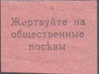 1915 1915(?) г. Разм. 31 х 23 мм. Одноцветная печать на розовой бумаге. Текст в три строки: «Жертвуйте на общественные посевы».