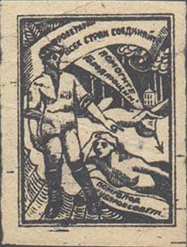 1922 1922(?) г. Разм. рамки 29,5 х 40 мм. Одноцветная печать на белой бумаге. В рамке аллегорический ри-сунок. Текст: «Пролетарии всех стран соединяйтесь. Помогите голодающим! Помголод Губ... совета».