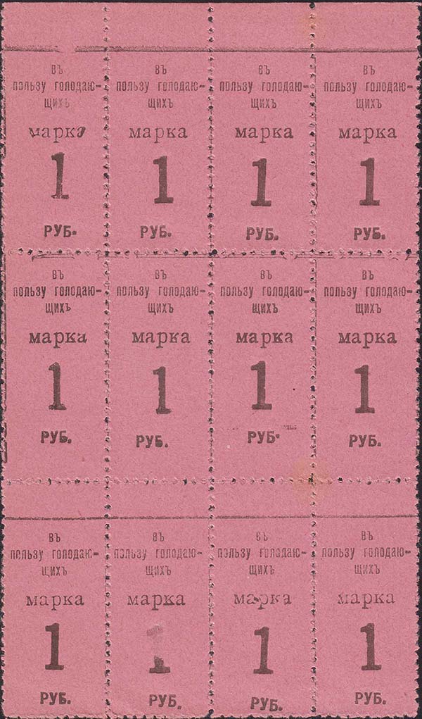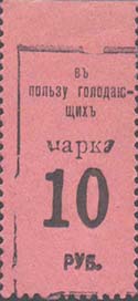 1917 1917 г. Разм. 17 х 41 мм. Одноцветная печать на розово-красной бумаге. Зубц. 11 1/2. Текст в шесть строк: «В пользу голодающих Марка 1 руб.».