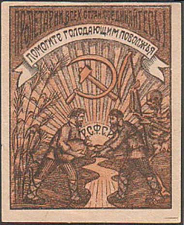 1922 1922(?) г. Разм. 60 х 72 мм. Двухцветная печать на тонкой кремовой бумаге. В прямоугольной рамке разм. 54 х 67 мм аллегорический рисунок, символизирующий победу над голодом. На фоне восходящего солнца с аббревиатурой «Р.С.Ф.С.Р.» крестьянин передает голодающему мешок с хлебом. Сверху серп и молот. Сверху текст: «Пролетарии всех стран соединяйтесь!». Ниже на ленте текст: «Помогите голодающим Поволжья».