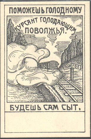 1922 1922(?) г. Разм. 51 х 78 мм. Одноцветная печать на толстой белой бумаге. В центре в прямоугольной рамке разм. 45 х 72 мм уходящий вдаль по рельсам поезд. На указателе текст: «Помгол». Над рисунком текст в две строки: «Курсант голодающим Поволжья». Выше и ниже рисунка текст: «Поможешь голодному – будешь сыт сам».