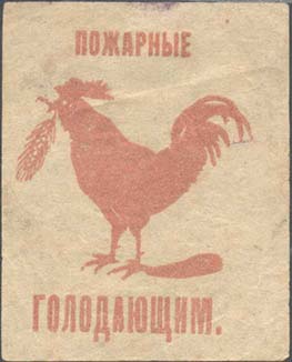 1922 1922(?) г. Разм. 44 х 56 мм. Одноцветная печать на сероватой бумаге. В центре изображение петуха с колосом в клюве. Текст: «Пожарные голодающим».
