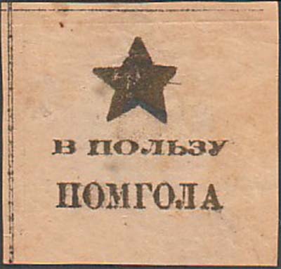 1922 1922(?) г. Разм. 60 х 56 мм. Одноцветная печать на желтоватой бумаге. В центре пятиконечная звезда. Ниже текст в две строки: «В пользу помгола».