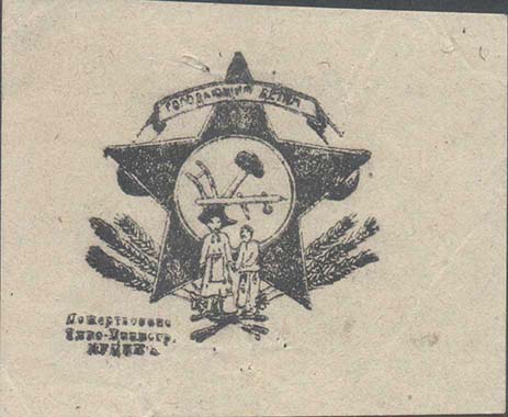 1922 1922(?) г. Разм. 77 х 63 мм. Одноцветная печать на сероватой бумаге. В центре двое детей на фоне пятиконечной звезд с серпом и молотом и колосьев пшеницы. Сверху на ленте текст: «Голодающим детям». Снизу слева текст в три строки: «Пожертвовано... (далее неразборчиво)».