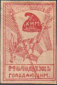 1922 1922(?) г. Разм. 26 х 37 мм. Одноцветная печать на желтоватой бумаге. В двойной прямоугольной рамке знамя с неразборчивым рисунком на полотнище на фоне лучей восходящего солнца. Внизу текст в две строки: «Молодежь голодающим».