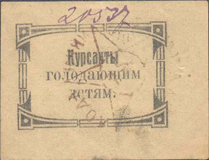 1922 1922(?) г. Разм. рамки 35 х 19 мм. Одноцветная печать на бумаге различных цветов. В прямоугольной декоративной рамке текст в три строки: «Курсанты голодающим детям». На лицевой стороне оттиск круглой печати с пятиконечной звездой и неразборчивым текстом.