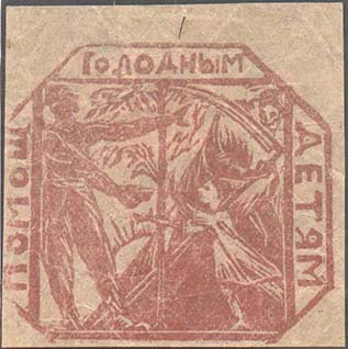 1922 1922(?) г. Разм. рамки 52 х 52 мм. Одноцветная печать на сероватой бумаге. В восьмиугольной рамке вписана квадратная рамка. В центре квадратной рамки крестьянин протягивает буханку хлеба ребенку. На заднем плане дерево и шалаш. По периметру рамки текст: «Помощь голодным детям».