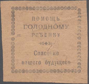 1922 1922(?) г. Разм. рамки 45 х 43 мм. Одноцветная печать на светло-коричнево-желтой оберточной бумаге. В прямоугольной рамке из декоративных элементов сверху текст в три строки: «Помощь голодному ребенку». В центре декоративный элемент. Внизу продолжение текста в две строки: «Спасение нашего будущего».