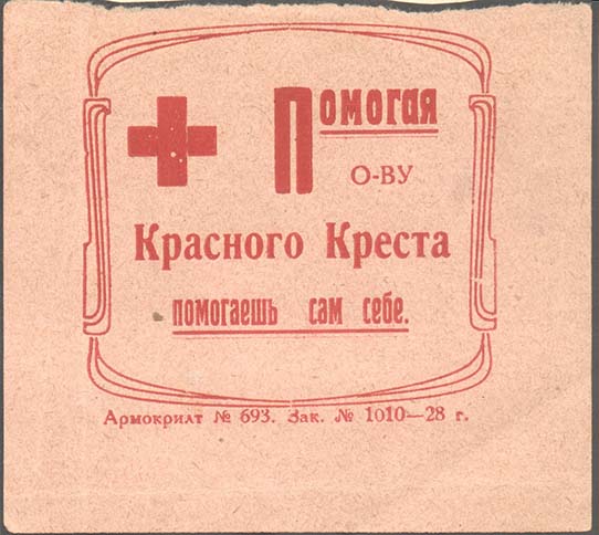 1928 1928 г. Разм. 90 х 80 мм. Одноцветная печать на желтоватой бумаге. В декоративной рамке разм. 63 х 58 мм в левом верхнем углу красный крест. Справа и внизу текст в четыре строки: «Помогая о-ву Красного Креста помогаешь сам себе». Внизу под рамкой выходные данные мелким шрифтом: «Армокрлит №693. Зак. № 1010-28 г.».